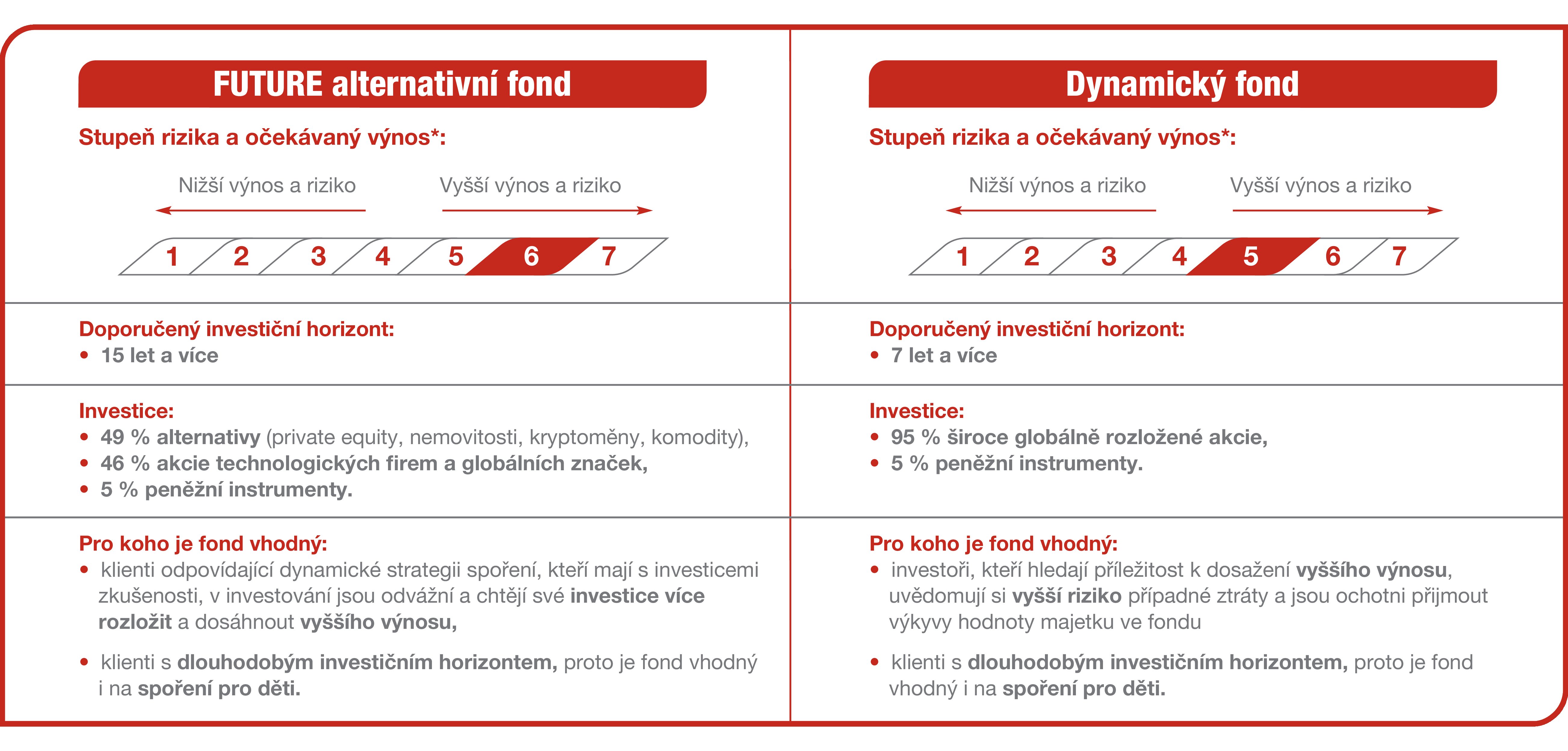 Hlavní rozdíl mezi FUTURE alternativním fondem a Dynamickým fondem je v jeho složení, tedy do čeho investují. Oba fondy jsou vhodné pro klienty, kteří plánují investovat dlouhodobě s cílem dosáhnout vysokého zhodnocení. FUTURE alternativní účastnický fond nabízí rozmanitější investiční příležitosti. Vedle akcií nejvýznamnějších světových značek investuje i do alternativních tříd aktiv. Díky alternativní složce je riziko investice do fondu více rozložené. Klientům, kteří jsou ochotni akceptovat vyšší kolísavost hodnoty, umožňuje dosáhnout vyšších výnosů než mohou nabídnout ostatní účastnické fondy.