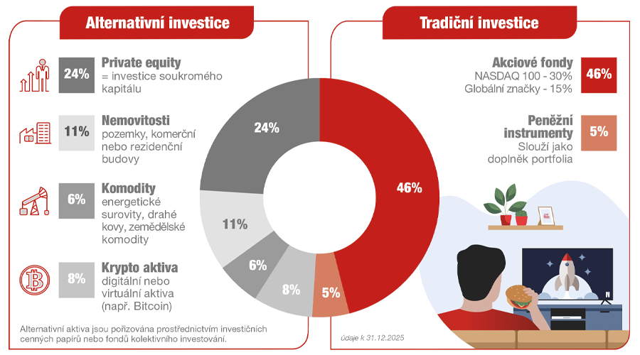 Druhou polovinu fondu tvoří alternativní investice, mezi které patří: