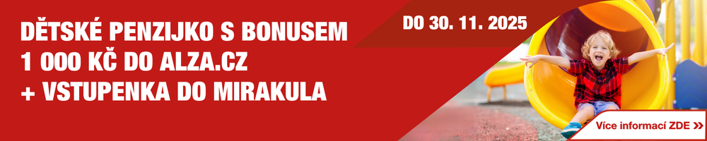 Ideální doba pro založení penzijního spoření je právě teď! Penzijko je jistota pro Vás i Vaše děti. Sobě spořením zajistíte finanční polštář do penze a dětem? Těm tak otevřete dveře k mnoha prvním dospěláckým snům. Proto neváhejte a začněte si spořit na penzi ještě dnes. Za sjednání smlouvy online Vás odměníme poukazem v hodnotě 1 000 Kč do Alza.cz. K dětskému penzijku sjednanému online do 30. 11. 2025 dostanete navíc ještě vstupenku ZDARMA do Mirakula.